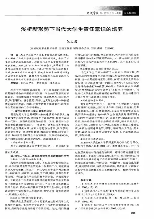 一、责任与当代大学生的责任意识当今社会,培养和提高大学生的责任意识,已成为教育界普遍关注的热门话题。