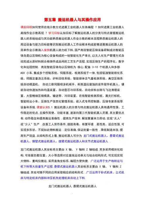 二、搬运机器人概述搬运机器人是一种能够自动执行货物搬运任务的移动设备。