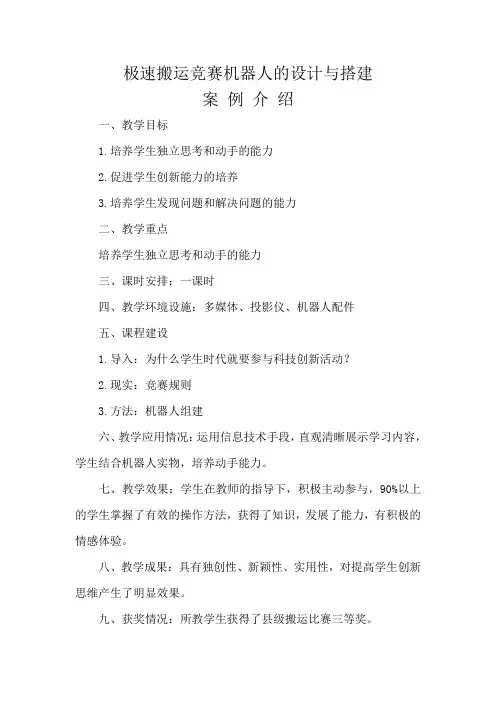 《搬运机器人》教学设计课程名称:搬运机器人教学设计课程时间:2小时目标学习者:小学三年级学生教学目标:1.了解搬运机器人的定义、用途和工作原理;2.理解机器人可以替代人类完成一些工作的优势和局限性;3.提高学生的创造力和解决问题的能力。