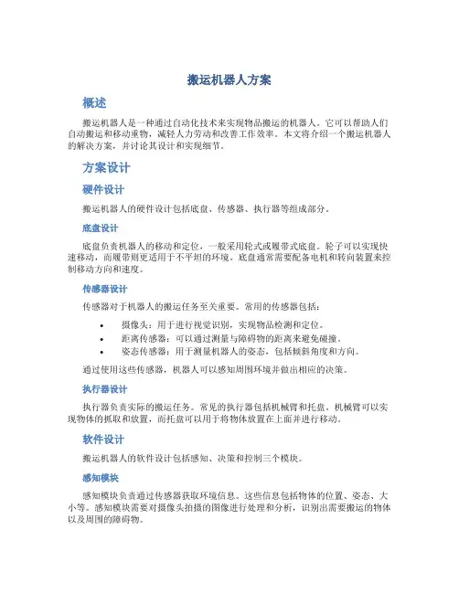 搬运机器人方案概述搬运机器人是一种通过自动化技术来实现物品搬运的机器人。