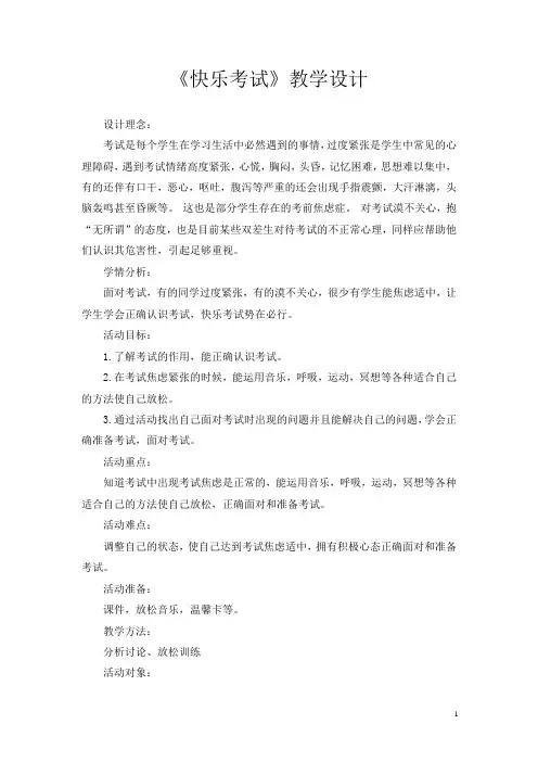 《快乐考试》教学设计设计理念:考试是每个学生在学习生活中必然遇到的事情,过度紧张是学生中常见的心理障碍,遇到考试情绪高度紧张,心慌,胸闷,头昏,记忆困难,思想难以集中,有的还伴有口干,恶心,呕吐,腹泻等严重的还会出现手指震颤,大汗淋漓,头脑轰鸣甚至昏厥等。