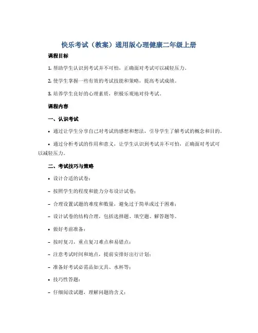 快乐考试(教案)通用版心理健康二年级上册课程目标1.帮助学生认识到考试并不可怕,正确面对考试可以减轻压力。