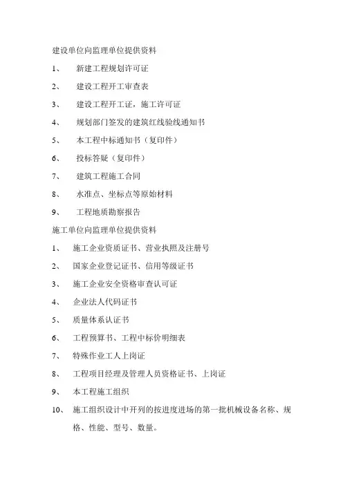 开工前业主应向项目监理部提交的文件及资料1)、建设工程施工许可证;2)、测绘定位(红线)图;3)、工程地质勘察报告、水文地质资料;4)、水准点、坐标点等原始资料;5)、经图审中心审查批准的设计图纸及设计文件6)、图纸审查意见书(建筑、结构、节能、电气、给排水、暖通、消防、幕墙)、图审意见回复;7)、本工程项目的中标通知书(如有),工程量清单;8)、施工承包合同;9)、业主与施工单位、勘察设计单位的主要负责人名单及联系方式;10)、移交于监理部办公设施清单;11)、防雷审核意见单开工前施工单位应向项目监理部提交的文件及资料1)、施工企业营业执照及资质证书、安全生产许可证复印件;2)、项目经理部管理人员情况一览表及有关证件。