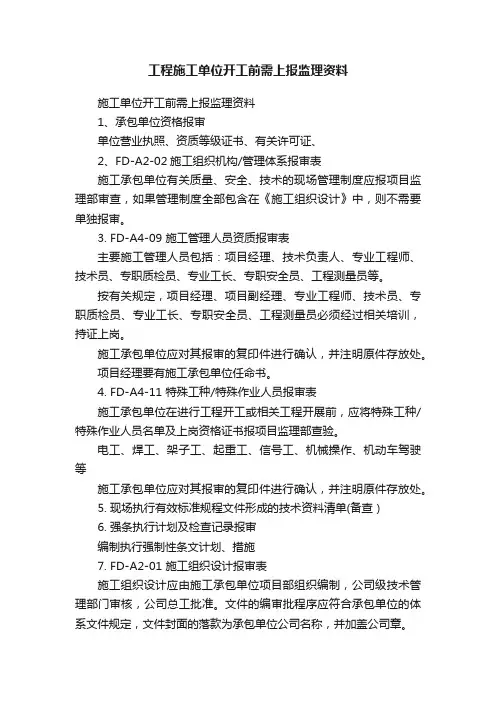 施工单位开工前需上报监理资料1、承包单位资格报审单位营业执照、资质等级证书、有关许可证、2、FD-A2-02 施工组织机构 / 管理体系报审表施工承包单位有关质量、安全、技术的现场管理制度应报项目监理部审查,如果管理制度全部包含在《施工组织设计》中,则不需要单独报审。