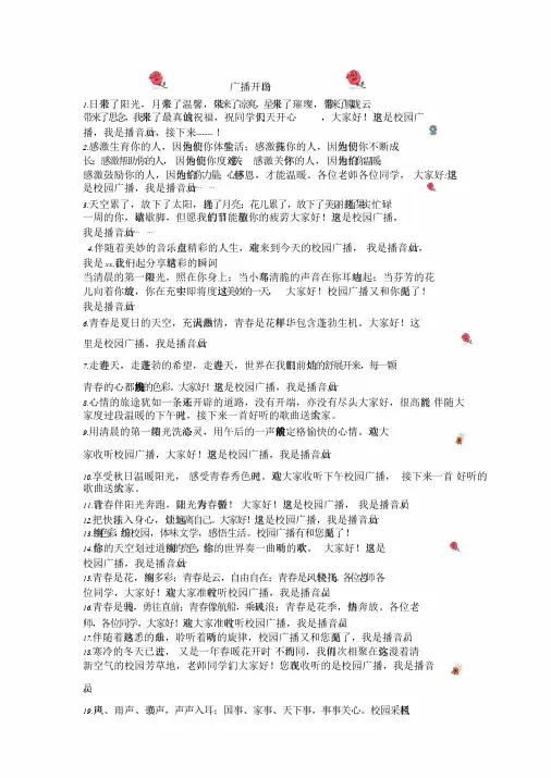 广播开场白1.日带来了阳光,月带来了温馨,风带来了凉爽,星带来了璀璨,雾带来了朦胧,云来了最真诚的祝福,祝同学们天天开心,大家好!这里是校园广带来了思念,我带X X,接下来------ !播,我是播音员2.感激生育你的人,因为他们使你体验生活;感激抚养你的人,因为他们使你不断成难关;感激关怀你的人,因为他们给你温暖;他们使你度过长;感激帮助你的人,因为感恩,才能温暖。