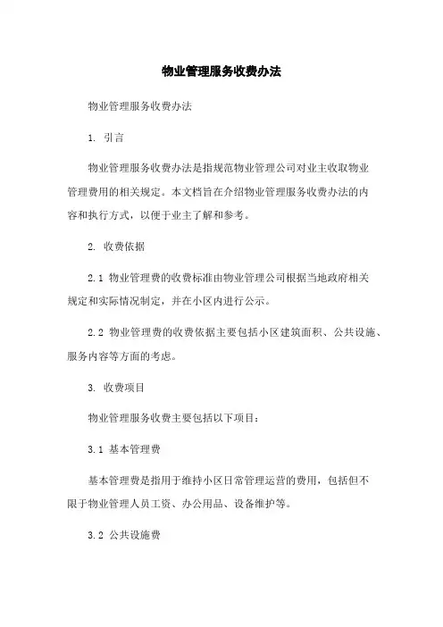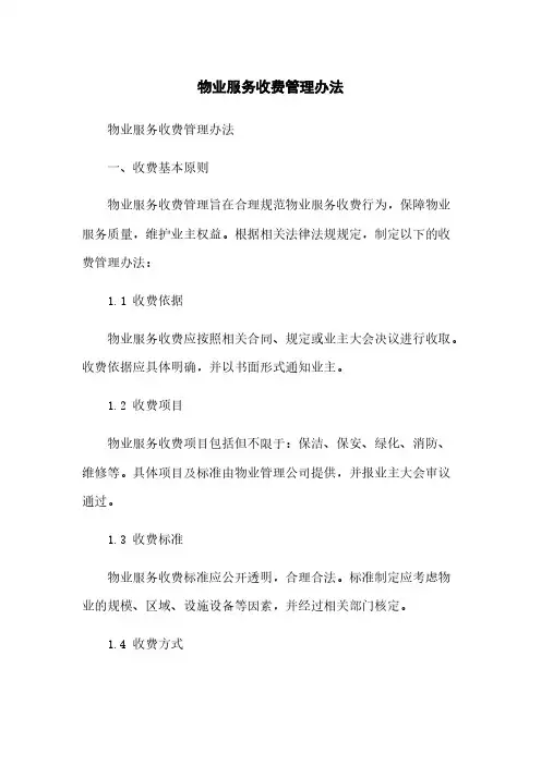 物业服务收费管理办法物业服务收费管理办法一、收费基本原则物业服务收费管理旨在合理规范物业服务收费行为,保障物业服务质量,维护业主权益。