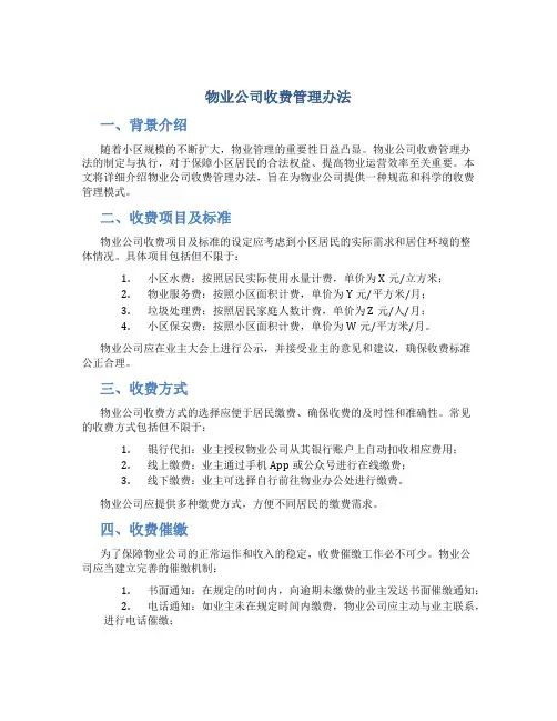 二、收费管理措施为确保物业服务收费的规范性和透明度,采取以下管理措施:2.1 收费公示物业服务收费项目和标准应当及时向业主公示,并在小区内明显位置张贴收费公示牌。