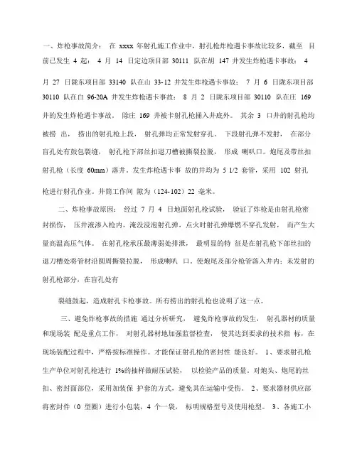一、炸枪事故简介: 在 xxxx 年射孔施工作业中,射孔枪炸枪遇卡事故比较多,截至 目前已发生 4 起: 4 月 14 日定边项目部 30111 队在胡 147 井发生炸枪遇卡事故; 4 月 27 日陇东项目部 33140 队在山 33-12 井发生炸枪遇卡事故; 7 月 6 日陇东项目部 30110 队在白 96-20A 井发生炸枪遇卡事故: 8 月 2 日陇东 项目部 30110 队在庄 169 井的发生炸枪遇卡事故。
