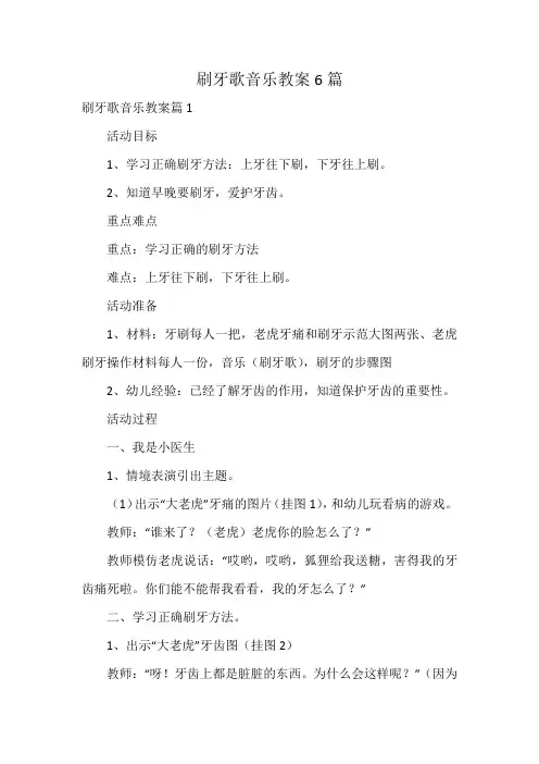 《刷牙歌》幼儿园大班音乐优秀教案通用十篇《刷牙歌》幼儿园大班音乐优秀教案 1活动目标:1、熟悉歌曲旋律,理解歌词内容,学唱歌曲,尝试在间奏处创编不同的刷牙节奏和快乐的象声词。