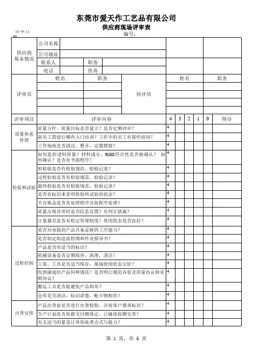 供应商现场考察表ZS-WI-PE-004序号 审核内容审核记录审核结果123451 质量管理体系1.1 建立ISO9001质量管理体系,相关组织和责任明确并文件化 1.2 本年度质量目标的设定及对策展开 1.3 有过程流程图、FMEA 、控制计划2 文件及信息管理2.1 有一套文件、资料的管理办法,且能贯彻实施2.2 对文件的制定、审批、发布、分发、使用、更改、作废、回收实施严格的管理控制,职责明确2.3 现场使用的产品图纸、工艺文件、检验文件均为有效版本3 现场管理 3.1 实施5S 管理3.2 适当的作业环境(防尘、防锈、照明、温湿度等) 3.3 零件、原材料/半成品、成品的生产、搬运、保管环境 3.4 零件、原材料/半成品、成品、不良品等的区分和定置 3.5 成品按包装设计和规程,进行包装堆放标识清楚 3.6库存品有适当的防护措施,能保证质量不至受损供应商现场考察表ZS-WI-PE-004序号 审核内容审核记录审核结果123454 批次管理4.1 制品上有确保批次管理的标识,并易于识别和追溯 4.2 制品的批次,搬动流动有记录,责任者明确 4.3 批次标识和履历确实保管,可实施查询5 外购及外协处理5.1 订购外购物资质量要求、技术标准、检验依据齐全 5.2 抽样方式正确、样本管理及保存有效5.3 检查过程识别(检查前、检查中、检查合格、不合格品) 5.4 检查不合格时,防止再发生的确实实施5.5 对主要外购物资的供应商进行了质量保证能力评价6 生产过程管理6.1 重要工序制定作业指导书,工人严格按照工艺文件操作 6.2 关键工序设置了质量控制点,控制文件齐全并已实施 6.3 对特殊工序的控制已规定了质量要求,并能连续监视 6.4按产品技术条件配置相应的监测装置,并满足精度要求,检验夹具应有使用说明书供应商现场考察表ZS-WI-PE-004序号 审核内容审核记录审核结果0 1 2 3 4 5 6.5 作业物品的识别管理(加工前、加工后、不良品) 6.6 有无通过防错、数量管理、过程检查、出库检查等手段,防止缺件、未加工、误组装等问题的发生?7 进料质量控制 7.1 合格供方名单7.2 查原材料检测情况(理化报告、供方质保书等) 7.3 进货验收记录是否齐全正确7.4 若不具备检测能力,是否委托具有资质的单位进行检测8 成品质量控制 8.1 成品检验作业指导书 8.2 成品检验记录9 不合格品的控制9.1 是否制定不合格品控制程序(处理流程) 9.2 不合格品是否作出标识、记录、隔离 9.3 不合格品是否经过评审、处置9.4是否制定返工/返修作业指导书,返工/返修产品的重检记录供应商现场考察表ZS-WI-PE-004序号 审核内容审核记录审核结果1234510 生产设备(含工装夹具)10.1 有无必要的设备、工装操作、保养方面的作业指导书 10.2 生产设备的点检项目、点检频度、判定基准有无明确?日常点检、定期点检有无进行?有无记录?10.3 专用工艺装备保养是否有记录 10.4 提供关键、重点设备台账10.5 关键、重点设备的维护保养实施记录11 检验11.1 各种产品的检验依据或技术规范齐全,且按此进行检验 11.2 提供试验及检测设备清单/状态11.3从原材料、协配件进厂到成品出厂的全过程检验都按规定进行11.4 各项原始记录、检测报告、统计台账和报表正确、齐全、及时11.5检验印章、标记、标签和合格证,严格按照规定执行供应商现场考察表ZS-WI-PE-004序号 审核内容审核记录审核结果0 1 2 3 4 5 11.6现场使用的测试设备和计量器具的使用、维护,有规定并定期抽检完好状态11.7 试验及检测设备校验计划及记录,在线量检具是否在有效期内(内校频次/校验员资质)11.8 检验人员是否经过培训并持证上岗(内培、外培记录、证书)12 纠正措施12.1 制定纠正措施文件并贯彻实施 12.2 能按8D 文件要求认真组织实施 12.3 防止再发对策有无确实实施13 人员培训13.1 在明确需求的前提下制定有明确的培训计划13.2对各岗位均按计划实施培训,并通过考核等方式了解受训人员情况,定岗使用,持证上岗审核得分合计(实得分/应得分)供应商现场考察表ZS-WI-PE-004序号审核内容审核记录审核结果0 1 2 3 4 5审核符合率(实得分/应得分*100%)总符合率≥85%,且每个审核项目的符合率≥75%,则现场审核通过。