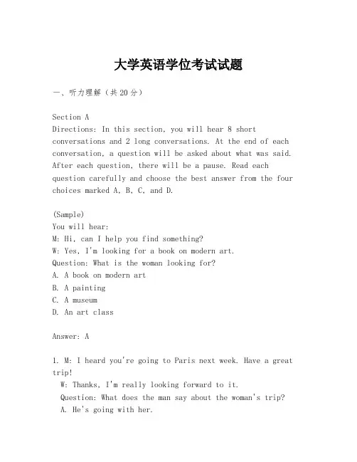 大学英语学位考试试题一、听力理解(共20分)Section ADirections: In this section, you will hear 8 short conversations and 2 long conversations. At the end of each conversation, a question will be asked about what was said. After each question, there will be a pause. Read each question carefully and choose the best answer from the four choices marked A, B, C, and D.(Sample)You will hear:M: Hi, can I help you find something?W: Yes, I'm looking for a book on modern art.Question: What is the woman looking for?A. A book on modern artB. A paintingC. A museumD. An art classAnswer: A1. M: I heard you're going to Paris next week. Have a great trip!W: Thanks, I'm really looking forward to it.Question: What does the man say about the woman's trip?A. He's going with her.B. He's heard about it.C. He's planning it.D. He's just met her.Answer: B(Continue with 7 more short conversations and 2 long conversations, each followed by a question.)Section BDirections: In this section, you will hear a passage and aset of questions on the passage. After each question, therewill be a pause. Read each question carefully and choose the best answer from the four choices marked A, B, C, and D.Listen to the passage carefully and answer questions 10 to 12.10. What is the main topic of the passage?A. The importance of environmental protection.B. The impact of technology on society.C. The challenges of urbanization.D. The benefits of renewable energy.Answer: B11. According to the passage, what is one of the negative effects of technology?A. It has increased unemployment.B. It has led to information overload.C. It has decreased productivity.D. It has caused environmental pollution.Answer: A12. What does the speaker suggest we should do?A. Rely more on technology.B. Limit the use of technology.C. Focus on education to adapt to technological changes.D. Ignore the negative effects of technology.Answer: C(End of Listening Comprehension)二、阅读理解(共30分)Section ADirections: Read the following passage. After reading it, you are required to complete the statements that follow. Each statement is followed by four suggested endings marked A, B, C, and D. Choose the one that best fits the context of the passage and mark your answer by blackening the corresponding letter on the Answer Sheet.Passage 1The rise of e-commerce has revolutionized the way we shop, making it possible to buy almost anything from the comfort of our own homes. However, this convenience comes at a cost to the environment, as the increase in package deliveries contributes to carbon emissions and waste.31. The main purpose of the passage is to _______.A. Discuss the benefits of e-commerceB. Highlight the environmental impact of online shoppingC. Explain how to shop onlineD. Promote brick-and-mortar stores32. What does the author imply about the convenience of e-commerce?A. It is a major advantage.B. It is outweighed by its environmental costs.C. It is not as significant as previously thought.D. It is only available to a select few.33. The author suggests that e-commerce has led to an increase in _______.A. Sales tax revenueB. Consumer satisfactionC. Carbon emissionsD. Product variety(Continue with more statements based on the passage.)Section BDirections: In this section, there is a short piece of writing. You are required to answer the questions by completing the sentences. Each sentence is followed by four choices marked A, B, C, and D. Choose the one that can best complete the sentence and mark your answer on the Answer Sheet.Passage 2Effective communication is essential in the workplace. It notonly facilitates understanding among colleagues but also helps to resolve conflicts and improve productivity.34. The passage suggests that effective communication is important because it _______.A. Reduces misunderstandingsB. Increases employee turnoverC. Decreases efficiencyD. Complicates tasks35. According to the passage, resolving conflicts is an example of _______.A. A barrier to effective communicationB. A result of poor communicationC. A benefit of effective communicationD. A sign of ineffective communication(Continue with more questions based on the passage.)(End of Reading Comprehension)三、词汇与语法(共20分)。