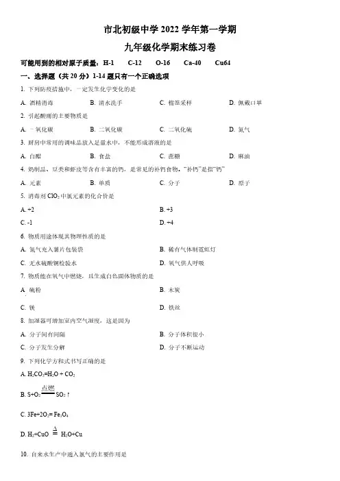 市北初级中学2022学年第一学期九年级化学期末练习卷可能用到的相对原子质量:H-1C-12O-16Ca-40Cu64一、选择题(共20分)1-14题只有一个正确选项1.下列防疫措施中,一定发生化学变化的是A.酒精消毒B.清水洗手C.棉签采样D.佩戴口罩2.引起酸雨的主要物质是A.一氧化碳B.二氧化碳C.二氧化硫D.氮气3.厨房中常用的调味品放入足量水中,不能形成溶液的是A.白醋B.食盐C.蔗糖D.麻油4.奶制品、豆类和虾皮等含有丰富的钙,是常见的补钙食物。
