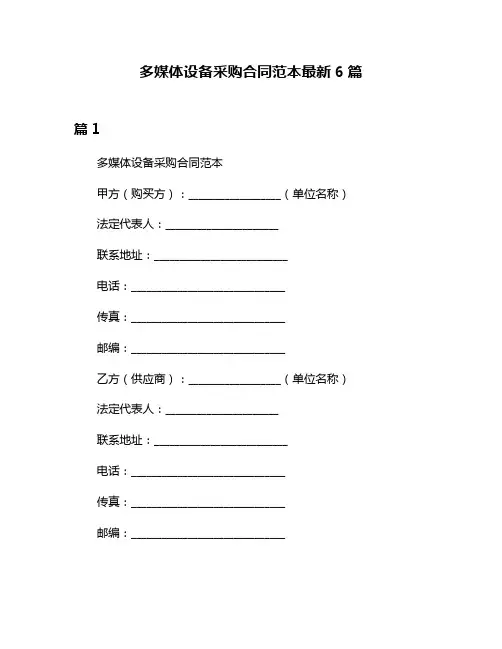 多媒体设备采购合同范本最新6篇篇1多媒体设备采购合同范本甲方(购买方):__________________(单位名称)法定代表人:______________________联系地址:__________________________电话:______________________________传真:______________________________邮编:______________________________乙方(供应商):__________________(单位名称)法定代表人:______________________联系地址:__________________________电话:______________________________传真:______________________________邮编:______________________________鉴于甲方欲购买多媒体设备,乙方同意向甲方出售下列多媒体设备(下称“设备”),双方经协商一致,达成如下合同:第一条产品名称、规格及数量:1. 产品名称:_______________2. 型号:____________________3. 数量:____________________第二条价格及支付方式:1. 单价:___________(大写:_________________)2. 总价:___________(大写:_________________)3. 支付方式:乙方发货后,甲方支付设备总价的70%,其余30%在收到设备后15天内支付。