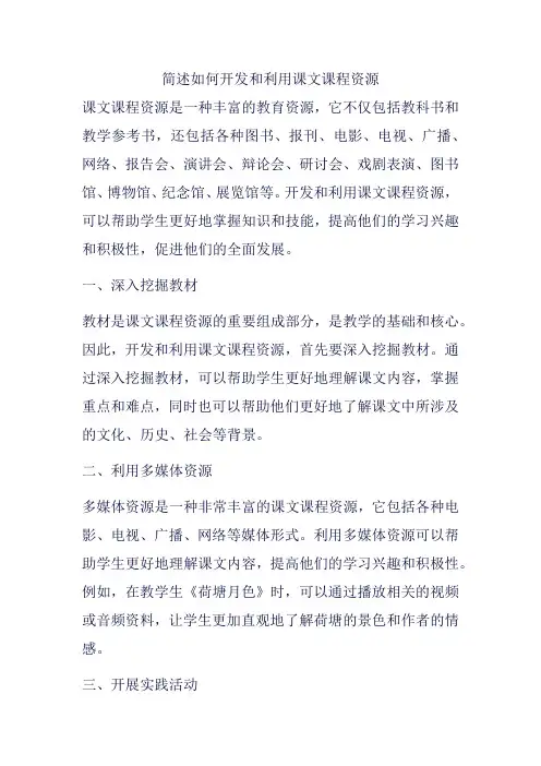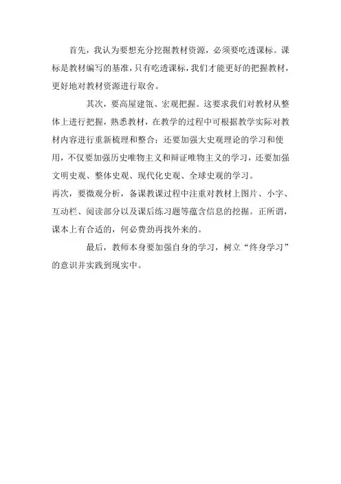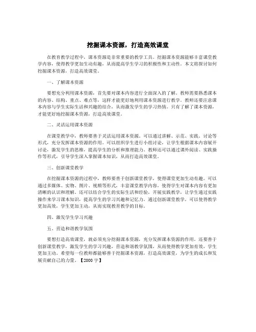 一、挖掘课本资源1. 精心选择教材在进行课本资源的挖掘时,首先需要对当前使用的教材进行认真的审视和分析。