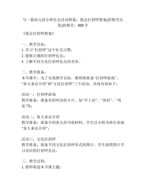 小班社会优秀教案及教学反思《我会打招呼》1. 教学背景本教案适用于小班社会课程的教学,主要面向3-4岁的幼儿。