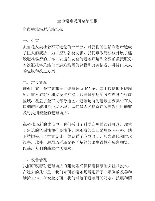 全市避难场所总结汇报全市避难场所总结汇报一、引言灾害是人类社会不可避免的一部分,对我们的生活和财产造成了巨大的威胁。