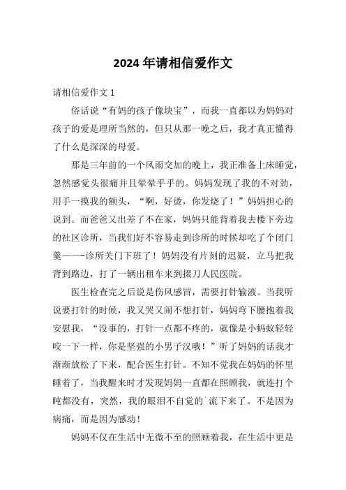 2024年相信爱作文篇相信爱作文1朝阳出来了,湖水为它梳妆;红花绽开了,绿叶为它映衬;鸟儿在鸣唱,蟋蟀为它伴奏;新月上来了,群星为它作伴。