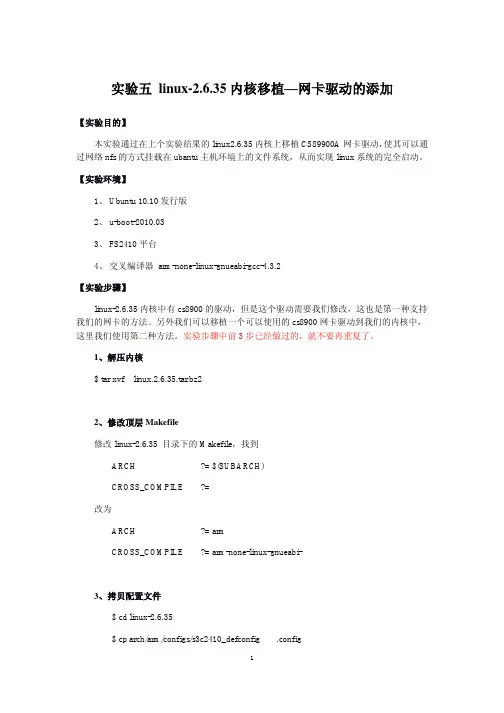 实验五linux-2.6.35内核移植—网卡驱动的添加【实验目的】本实验通过在上个实验结果的linux2.6.35内核上移植CS89900A网卡驱动,使其可以通过网络nfs的方式挂载在ubantu主机环境上的文件系统,从而实现linux系统的完全启动。