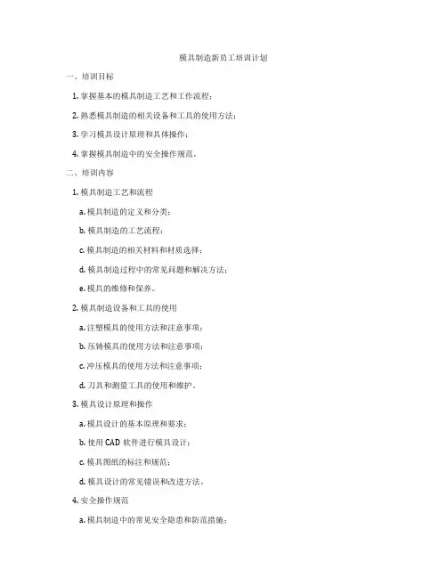 模具制造新员工培训计划一、培训目标1. 掌握基本的模具制造工艺和工作流程;2. 熟悉模具制造的相关设备和工具的使用方法;3. 学习模具设计原理和具体操作;4. 掌握模具制造中的安全操作规范。