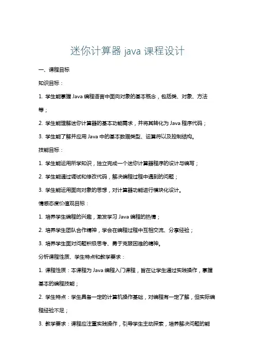 迷你计算器java课程设计一、课程目标知识目标:1. 学生能掌握Java编程语言中面向对象的基本概念,包括类、对象、方法等;2. 学生能理解迷你计算器的基本功能需求,并将其转化为Java程序代码;3. 学生能了解并应用Java中的基本数据类型、运算符以及控制结构。