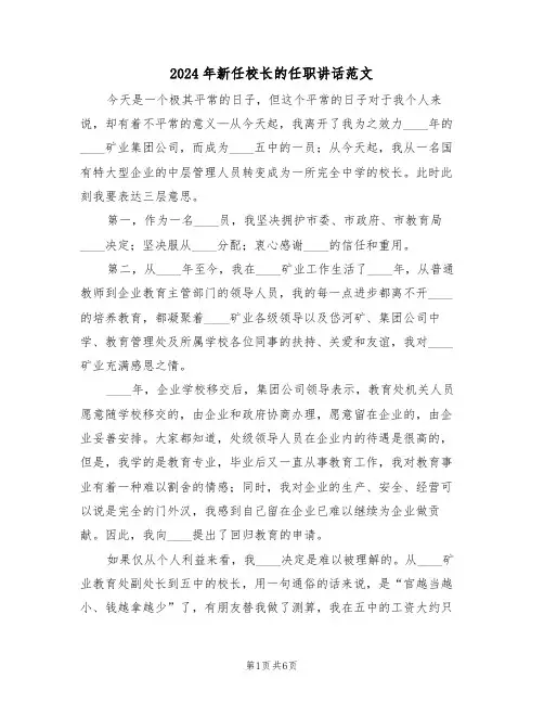 文档下载后可定制修改,请根据实际需要进行调整和使用,谢谢!并且,本店铺为大家提供各种类型的实用资料,如教学心得体会、工作心得体会、学生心得体会、综合心得体会、党员心得体会、培训心得体会、军警心得体会、观后感、作文大全、其他资料等等,想了解不同资料格式和写法,敬请关注!Download tips: This document is carefully compiled by this editor.I hope that after you download it, it can help you solve practical problems. The document can be customized and modified after downloading, please adjust and use it according to actual needs, thank you!And, this store provides various types of practical materials for everyone, such as teaching experience, work experience, student experience, comprehensive experience, party member experience, training experience, military and police experience, observation and feedback, essay collection, other materials, etc. If you want to learn about different data formats and writing methods, please pay attention!学校新校长上任就职讲话2024年新校长要讲政治作表率,坚决拥护市委决定。