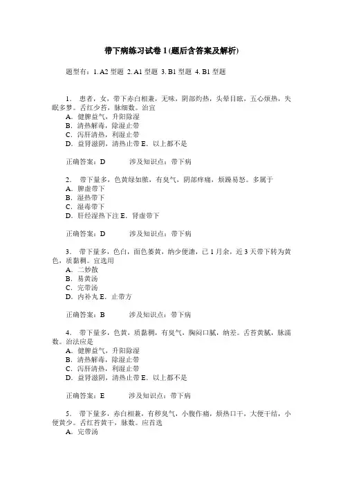 带下选择题1、白带清冷量多,质稀薄,终日淋漓不断,腰酸如折,应首选:A.内补丸B.完带汤C.易黄汤D.肾气丸E.止带方2、带下量不甚多,色黄或赤白相兼,质稠或有臭气,阴部干涩有灼热感,多由下列哪项所致:A.气虚不固B.肾精滑脱而下C.脾虚湿浊下注D.阴虚挟湿E.感染湿毒3、阴虚挟湿带下过多的治法是:A.健脾益气,升阳除湿B.清热利湿,止带C.温肾助阳,涩精止带D.滋阴益肾,清热祛湿E.清热解毒,除湿止带4、知柏地黄丸用于下列何种异常带下:A.脾虚带下过多B.肾虚带下过多C.阴虚挟湿带下过多D.湿毒带下过多E.湿热带下过多5、带下量多,色黄或赤白相兼,质稠有臭气,阴部有灼热感应首选:A.完带汤B.内补丸C.止带方D.知柏地黄丸E.易黄汤6、带下量多,色黄,黏稠,有臭气,或呈泡沫状,或呈豆腐渣样,伴阴部瘙痒,多由下列哪项所致:A.脾虚湿浊下注B.肾虚精关不固C.阴虚复感湿邪D.湿热互结,流注下焦E.感染湿毒,损伤任带7、止带方用于下列何种带下:A.脾虚带下过多B.肾虚带下过多C.阴虚挟湿带下过多D.湿热下注带下过多E.湿毒带下过多8、下述哪些证候宜用止带方:A.带下稠黏色黄B.带下清冷C.带下量多,稀薄D.带下色白,无臭气E.带下量多,色黄,有臭气,或伴外阴瘙痒9、带下量多,黄绿如脓,或赤白相兼,或五色杂兼,臭秽难闻,多由下列哪项所致:A.脾虚湿浊下注B.肾虚精关不固C.湿热流注下焦D.气虚不固E.湿毒内侵,伤及任带10、五味消毒饮用于下列何种带下:A.脾虚带下过多B.湿热带下过多C.肾虚带下过多D.湿毒带下过多E.寒湿带下过多简答题:(1)带下病常见的病因病机是什么?(2)如何鉴别湿热带下过多与脾虚带下过多,写出各自的治疗原则及代表方剂。