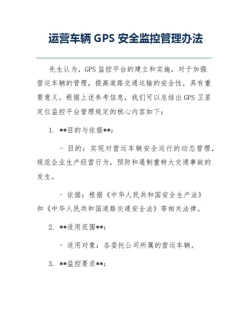 1. 目的和范围1.1 目的本管理办法的目的在于规范运营车辆的GPS安全监控管理,通过明确各方责任,加强数据安全,提高行车安全,保证运输的高效运行。