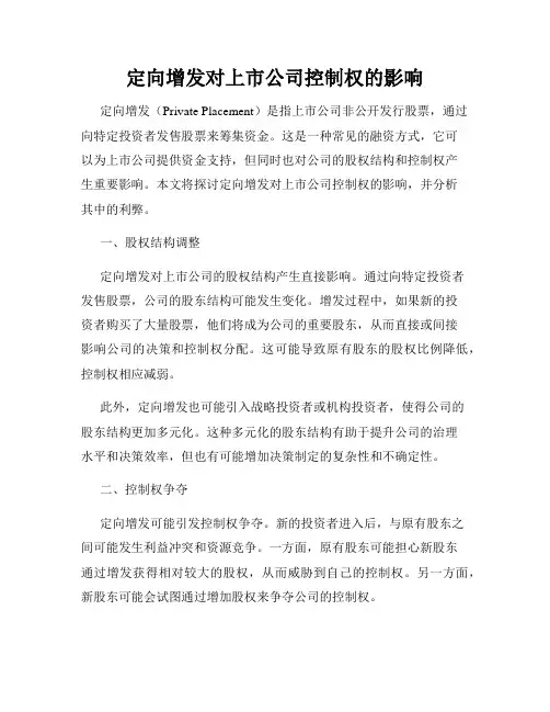 一、定向增发的基本概念1. 定义:定向增发是指上市公司向特定对象发行股票,包括向公司控股股东、实际控制人及其关联人、战略投资者等发行股票。