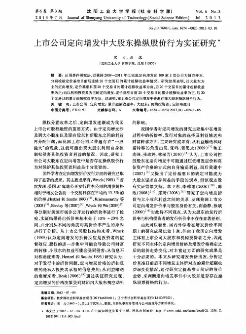 关键词:大股东控制;定向增发一、引言自股权分置改革以来,定向增发开始成为中国资本市场最主流的权益再融资方式。