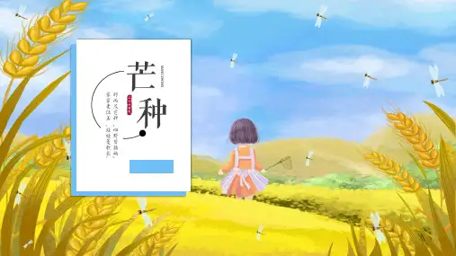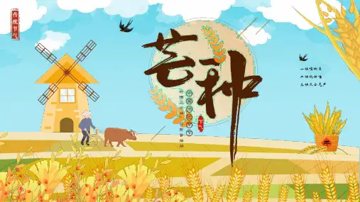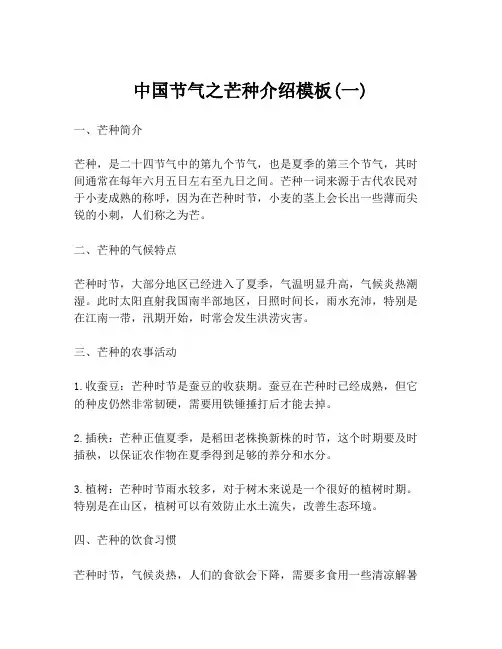中国节气之芒种介绍模板(一)一、芒种简介芒种,是二十四节气中的第九个节气,也是夏季的第三个节气,其时间通常在每年六月五日左右至九日之间。