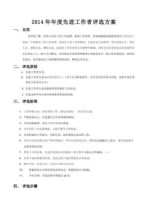 2014年年度先进工作者评选方案一、目的为全面了解、评价公司员工的工作成绩,提高工作效率,有效地激励表现优秀的员工并为员工创造一个积极向上的工作氛围,调动员工的工作积极性;弘扬企业文化精神,充分发掘人才、留住人才,鼓励先进、鞭策后进;加强员工对企业的认同感和归属感,同时也为企业的长远发展提供合适的储备人才;树立公司模范,从而提高企业管理和精神文明建设水平,树立你争我赶创一流的竞争意识,充分调动员工的积极性和创造性,特制定本办法。