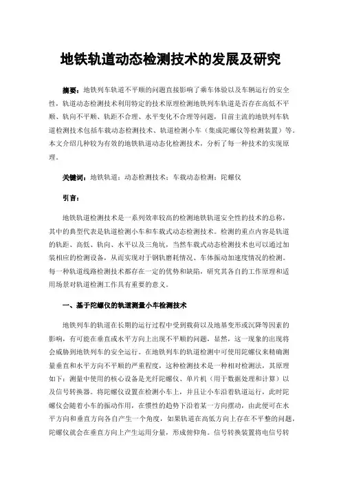 关键词:地铁轨道;动态检测技术;车载动态检测;陀螺仪引言:地铁轨道检测技术是一系列效率较高的检测地铁轨道安全性的技术的总称,其中的典型代表是轨道检测小车和车载式动态检测技术。
