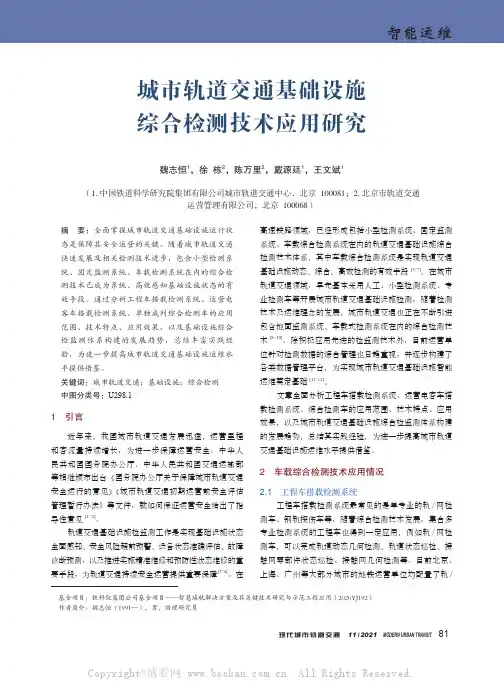 目前北京、上海、广州等大部分城市的地铁运营单位均配置了轨/城市轨道交通基础设施综合检测技术应用研究魏志恒1,徐 栋2,陈万里2,戴源廷1,王文斌1(1. 中国铁道科学研究院集团有限公司城市轨道交通中心,北京 100081;2. 北京市轨道交通运营管理有限公司,北京 100068)摘 要:全面掌握城市轨道交通基础设施运行状态是保障其安全运营的关键。