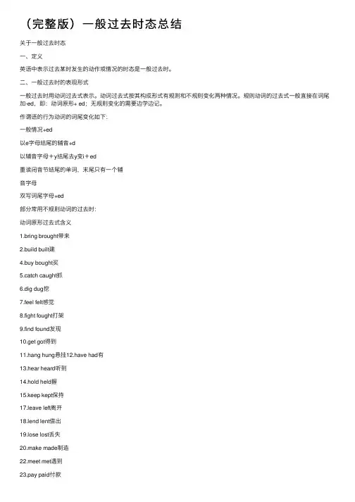 (完整版)⼀般过去时态总结关于⼀般过去时态⼀、定义英语中表⽰过去某时发⽣的动作或情况的时态是⼀般过去时。