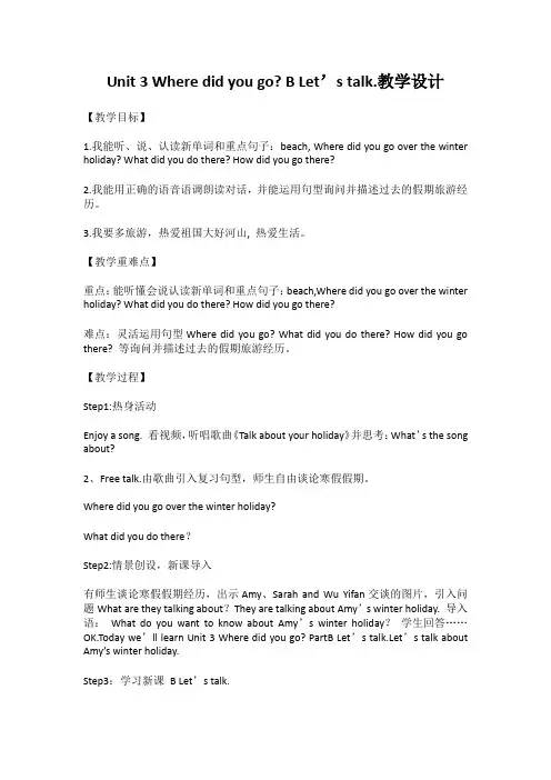 Unit 3 Where did you go? B Let’s talk.教学设计【教学目标】1.我能听、说、认读新单词和重点句子:beach, Where did you go over the winter holiday? What did you do there? How did you go there?2.我能用正确的语音语调朗读对话,并能运用句型询问并描述过去的假期旅游经历。