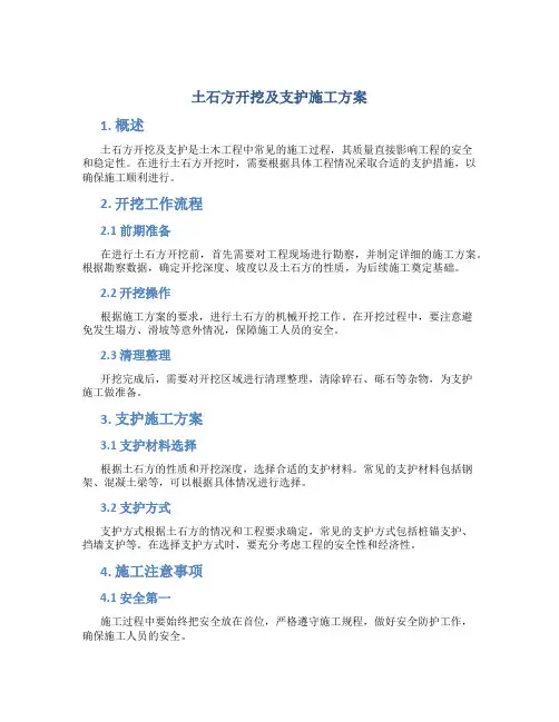 二、工程概况1.工程名称:XXXX工程2.工程地点:XXXX省XX市3.工程内容:土石方开挖与支护三、施工准备1.人员准备:–施工人员按照施工计划进行组织,人员必须经过专业培训,并具备相应证书。