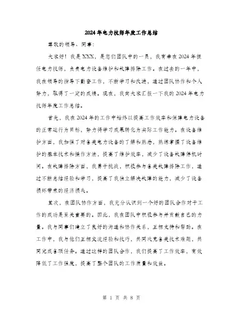 篇二:电力技师年度工作总结范文电力技师年度工作总结范文这是一篇电力技师年度工作总结范文。