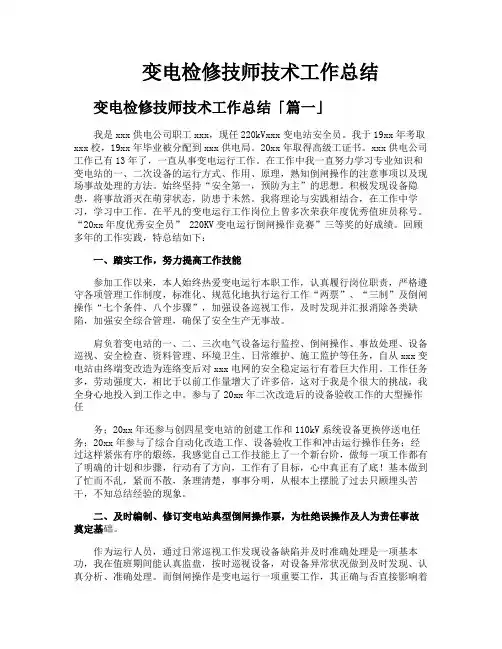 变电检修技师技术工作总结变电检修技师技术工作总结「篇一」我是xxx供电公司职工xxx,现任220kVxxx变电站安全员。