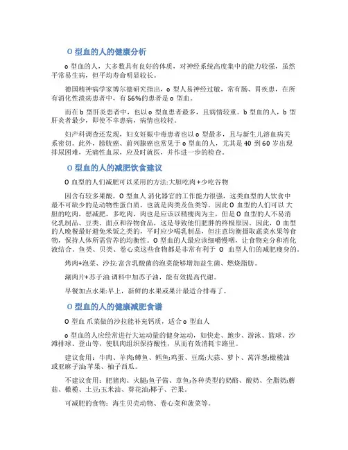 O型血减肥食谱:(本人从7月初开始减到现在45公斤,163cm 所有心得源自于亲身经验!!!)早餐:早上起来刷完牙,喝一大杯温开水,水温视季节或个人喜好而定多选(可用作前期减肥到后期减肥的早餐选择,亦可作减肥结束前一周里早餐的种类)1)一个小肉包,一个水煮鸡蛋,一个苹果,一粒牛初乳钙片2)一小团紫薯,一个水煮鸡蛋,一个苹果,一粒牛初乳钙片2)一小团紫薯,一根烤肠,一个苹果,一粒牛初乳钙片3)一小团紫薯,两片全麦消化饼干,一个苹果,一粒牛初乳钙片4)一碗紫菜虾皮汤,一个煎蛋,两片苏打饼干(或者3跟pocky,本人最爱抹茶注心口味),一个苹果,一粒牛乳钙5)一碗白粥,一个煎蛋,一碟酱菜,一个苹果,一粒牛乳钙,加2小包海苔片注:甘薯是O型血的推荐食品,非常好吃且营养丰富。