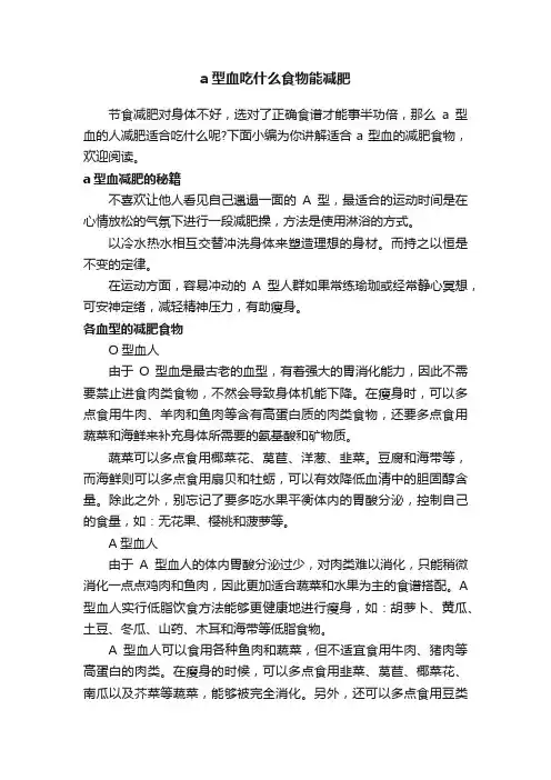 血型饮食减肥血型饮食减肥是一种根据个人血型特点来制定饮食计划的减肥方法。