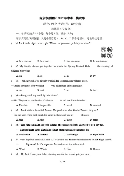 南京市鼓楼区2019年中考—模试卷(满分:90分考试时间:100分钟)选择题(共40分)—、单项填空(共15小题;每小题1分,满分15分)请认真阅读下列各题,从题中所给的A、B、C、D四个选项中,选出最佳选项。
