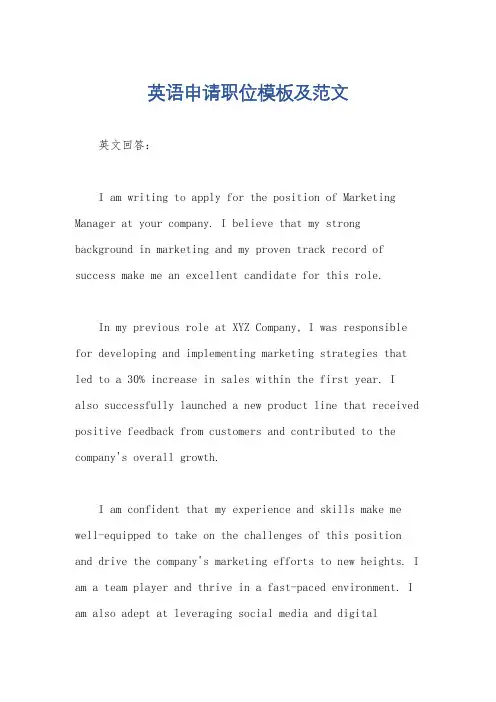 英语申请职位模板及范文英文回答:I am writing to apply for the position of Marketing Manager at your company. I believe that my strong background in marketing and my proven track record of success make me an excellent candidate for this role.In my previous role at XYZ Company, I was responsible for developing and implementing marketing strategies that led to a 30% increase in sales within the first year. I also successfully launched a new product line that received positive feedback from customers and contributed to the company's overall growth.I am confident that my experience and skills make me well-equipped to take on the challenges of this position and drive the company's marketing efforts to new heights. I am a team player and thrive in a fast-paced environment. I am also adept at leveraging social media and digitalmarketing channels to reach and engage with target audiences.I am excited about the opportunity to bring my expertise to your team and help contribute to the company's continued success.中文回答:我写信是想申请贵公司的市场经理职位。