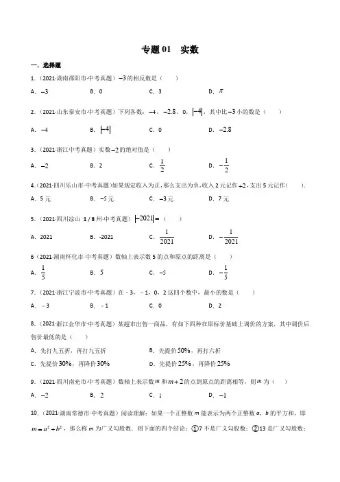 专题01 实数一.选择题1.(2021·湖南邵阳市·中考真题)3-的相反数是()A.3-B.0 C.3 D.π2.(2021·山东泰安市·中考真题)下列各数:4-, 2.8-,0,4-,其中比3-小的数是()A.4-B.4-C.0 D. 2.8-3.(2021·浙江中考真题)实数2-的绝对值是()A.2-B.2 C.12D.12-4.(2021·四川乐山市·中考真题)如果规定收入为正,那么支出为负,收入2元记作2+,支出5元记作().A.5元B.5-元C.3-元D.7元5.(2021·四川凉山1 / 8州·中考真题)2021-=()A.2021 B.-2021 C.12021D.12021-6(2021·湖南怀化市·中考真题)数轴上表示数5的点和原点的距离是()A.15B.5C.5-D.15-7.(2021·浙江宁波市·中考真题)在﹣3,﹣1,0,2这四个数中,最小的数是()A.﹣3 B.﹣1 C.0 D.28.(2021·浙江金华市·中考真题)某超市出售一商品,有如下四种在原标价基础上调价的方案,其中调价后售价最低的是()A.先打九五折,再打九五折B.先提价50%,再打六折C.先提价30%,再降价30%D.先提价25%,再降价25%9.(2021·四川南充市·中考真题)数轴上表示数m和2m+的点到原点的距离相等,则m为()A.2-B.2C.1D.1-10.(2021·湖南常德市·中考真题)阅读理解:如果一个正整数m能表示为两个正整数a,b的平方和,即22m a b=+,那么称m为广义勾股数.则下面的四个结论:①7不是广义勾股数;②13是广义勾股数;③两个广义勾股数的和是广义勾股数;④两个广义勾股数的积是广义勾股数.依次正确的是( ) A .②④ B .①②④ C .①② D .①④11.(2021·湖北黄冈市·中考真题)2021年5月15日07时18分,我国首个火星探测器“天问一号”经过470000000公里旅程成功着陆在火星上,从此,火星上留下中国的脚印,同时也为我国的宇宙探测之路迈出重要一步.将470000000用科学记数法表示为( )A .74710⨯B .74.710⨯C .84.710⨯D .90.4710⨯12.(2021·天津中考真题)计算()53-⨯的结果等于( )A .2-B .2C .15-D .1513.(2021·新疆中考真题)下列实数是无理数的是( )A .2-B .1CD .214.(2021·湖南长沙市·中考真题)下列四个实数中,最大的数是( )A .3-B .1-C .πD .415.(2021·湖南岳阳市·-1,0,2中,为负数的是( )A B .-1 C .0 D .216.(2021·浙江台州市·之间的整数有( )A .0个B .1个C .2个D .3个17.(2021·浙江金华市·中考真题)实数12-,2,3-中,为负整数的是( )A .12- B .C .2 D .3-18.(2021·四川资阳市·中考真题)若a =b =2c =,则a ,b ,c 的大小关系为( )A .b c a <<B .b a c <<C .a c b <<D .a b c <<19.(2021·浙江中考真题)已知,a b 是两个连续整数,1a b <<,则,a b 分别是( )A .2,1--B .1-,0C .0,1D .1,220.(2020·四川攀枝花市·中考真题)下列说法中正确的是( ).A .0.09的平方根是0.3B 4=±C .0的立方根是0D .1的立方根是±121.(2020·四川达州市·中考真题)中国奇书《易经》中记载,远古时期,人们通过在绳子上打结来计数,即“结绳计数”.如图,一位母亲在从右到左依次排列的绳子上打结,满5进1,用来记录孩子自出生后的天数.由图可知,孩子自出生后的天数是( )A .10B .89C .165D .29422.(2020·山东菏泽市·中考真题)下列各数中,绝对值最小的数是( )A .5-B .12C .1- D23.(2020·江苏宿迁市·中考真题)在△ABC 中,AB=1,下列选项中,可以作为AC 长度的是( ) A .2 B .4 C .5 D .624.(2020·四川攀枝花市·中考真题)实数a 、b 在数轴上的位置如图所示,化简的结果是( ).A .2-B .0C .2a -D .2b25.(2020·湖南株洲市·中考真题)一实验室检测A 、B 、C 、D 四个元件的质量(单位:克),超过标准质量的克数记为正数,不足标准质量的克数记为负数,结果如图所示,其中最接近标准质量的元件是( ) A . B . C . D .26.(2020·北京中考真题)实数a 在数轴上的对应点的位置如图所示.若实数b 满足a b a -<<,则b 的值可以是( )A .2B .-1C .-2D .-327.(2020·湖南长沙市·中考真题)2020年3月14日,是人类第一个“国际数学日”这个节日的昵称是“π(Day )”国际数学日之所以定在3月14日,是因为3.14与圆周率的数值最接近的数字,在古代,一个国家所算的的圆周率的精确程度,可以作为衡量这个国家当时数学与科技发展的水平的主要标志,我国南北朝时期的祖冲之是世界上最早把圆周率的精确值计算到小数点后第七位的科学巨匠,该成果领先世界一千多年,以下对圆周率的四个表述:①圆周率是一个有理数;②圆周率是一个无理数;③圆周率是一个与圆的大小无关的常数,它等于该圆的周长与直径的比;④圆周率是一个与圆大小有关的常数,它等于该圆的周长与半径的比;其中正确的是( )A .②③B .①③C .①④D .②④28.(2020·黑龙江大庆市·中考真题)若2|2|(3)0x y ++-=,则x y -的值为( )A .-5B .5C .1D .-129.(2020·山东烟台市·中考真题)实数a ,b ,c 在数轴上的对应点的位置如图所示,那么这三个数中绝对值最大的是( )A .aB .bC .cD .无法确定30.(2020·四川乐山市·中考真题)数轴上点A 表示的数是3-,将点A 在数轴上平移7个单位长度得到点B .则点B 表示的数是( )A .4B .4-或10C .10-D .4或10-31.(2020·湖南郴州市·中考真题)如图表示互为相反数的两个点是( )A .点A 与点B B .点A 与点DC .点C 与点BD .点C 与点D32.(2019·台湾中考真题)数线上有O 、A 、B 、C 四点,各点位置与各点所表示的数如图所示.若数线上有一点D ,D 点所表示的数为d ,且5d d c -=-,则关于D 点的位置,下列叙述何者正确?( )A .在A 的左边B .介于A 、C 之间 C .介于C 、O 之间D .介于O 、B 之间 33.(2019·江苏徐州市·中考真题)如图,数轴上有O 、A 、B 三点,O 为O 原点,OA 、OB 分别表示仙女座星系、M87黑洞与地球的距离(单位:光年).下列选项中,与点B 表示的数最为接近的是( )A .6510⨯B .710C .7510⨯D .81034.(2019·山东枣庄市·中考真题)点,,,O A B C 在数轴上的位置如图所示,O 为原点,1AC =,OA