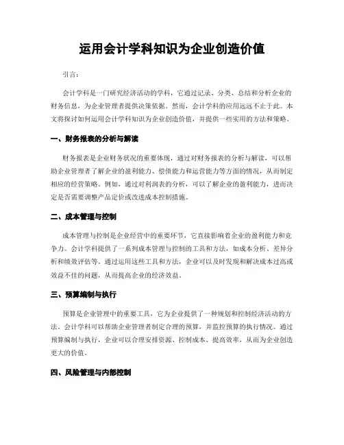 运用会计学科知识为企业创造价值引言:会计学科是一门研究经济活动的学科,它通过记录、分类、总结和分析企业的财务信息,为企业管理者提供决策依据。