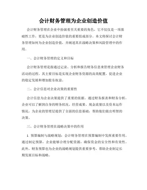 会计财务管理为企业创造价值会计财务管理在企业中扮演着至关重要的角色,它不仅仅是一项基础性工作,更是为企业创造价值的重要组成部分。