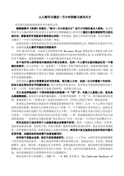 一万小时天才理论The Tale nt Code英语美文The 10,000-Hour Rule says that you need approximately 10,000 hours of practice to become a world-class expert in a field. There is no other way: if you want to be a world-class expert in your field, you must do your 10,000 hours of practice.一万小时天才理论说的是:要想成为这一领域的世界级专家,你就需要花大约一万个小时来练习。