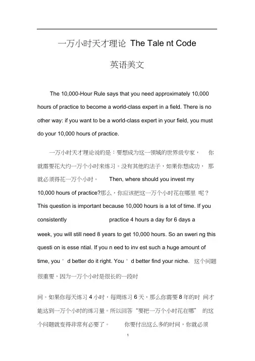 The Talent Code一万小时天才理论onefamoustheorythescientistsputforwardis“10,000-HourRule”.Therulesaysthatyouneedapproximately110,000hoursofpracticetobecomeaworld-classexpertinafield.Thereisnootherw ay.Ifyouwanttobeaworld-classexpertinyourfield,youmustdoyour10,000hoursofpractice.Then,whereshouldyouinvest2your10,000hoursofpractice?科学家们提出了一个著名的“一万小时天才理论”,该理论称:练习一万个小时,你就能成为某领域的世界级大师。