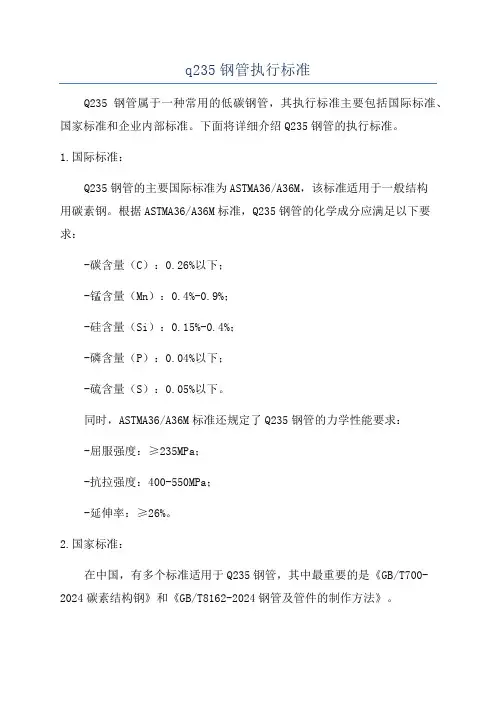 q235钢管执行标准Q235钢管属于一种常用的低碳钢管,其执行标准主要包括国际标准、国家标准和企业内部标准。