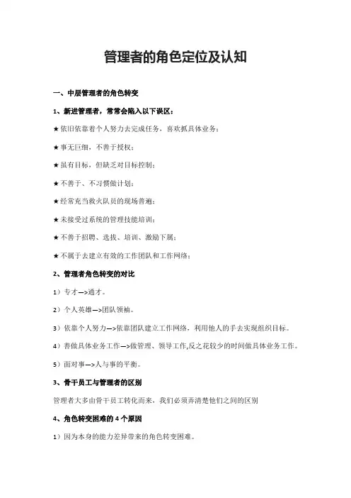 管理者的角色定位及认知一、中层管理者的角色转变1、新进管理者,常常会陷入以下误区:★依旧依靠着个人努力去完成任务,喜欢抓具体业务;★事无巨细,不善于授权;★虽有目标,但缺乏对目标控制;★不善于、不习惯做计划;★经常充当救火队员的现场普遍;★未接受过系统的管理技能培训;★不善于招聘、选拔、培训、激励下属;★不属于去建立有效的工作团队和工作网络;2、管理者角色转变的对比1)专才—>通才。