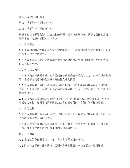 评估机构合作协议合同范本合同编号:评估机构合作协议地址:联系人:电话:地址:联系人:电话:鉴于:1. 甲方为一家评估机构,具备相关资质和经验;2. 乙方希望与甲方合作,委托甲方为其进行评估工作;一、评估内容_______________________________________________________________________________________________________________________________________________________________________________________________________________________________________1.2 评估的具体范围、方法和标准由甲方根据乙方的需求和相关法律法规进行确定,并在双方签订本合同后另行约定。